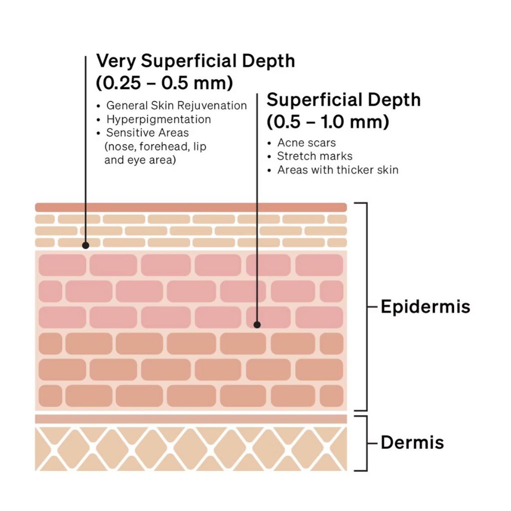 For first time clients, it is good practice to start with a shallow depth, then assess the skin’s tolerance before increasing it.